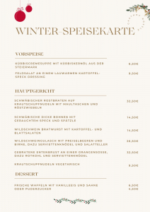 In der kalten Jahreszeit verwöhnen wir Sie mit herzhaften Klassikern und saisonalen Spezialitäten aus unserer Winterküche. Freuen Sie sich auf traditionelle schwäbische Gerichte, Wildspezialitäten und süße Desserts; frisch zubereitet, regional geprägt und mit viel Liebe zum Detail.